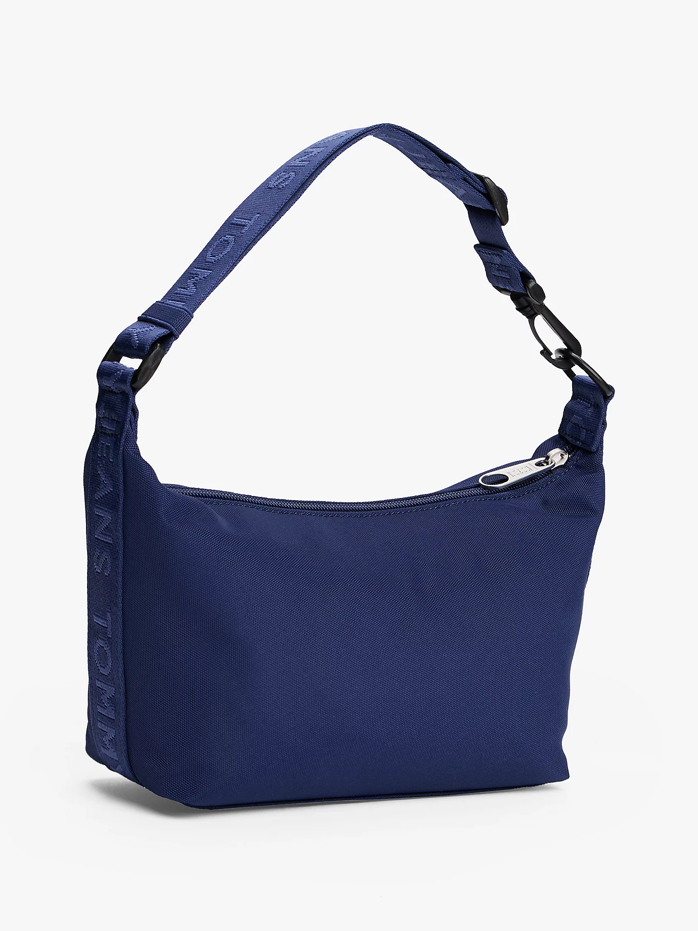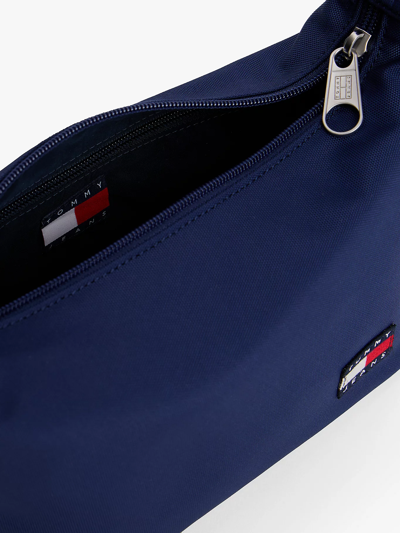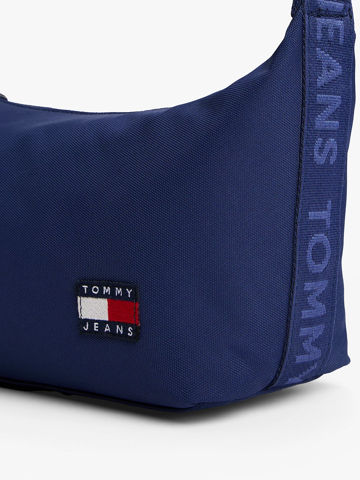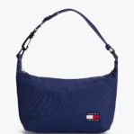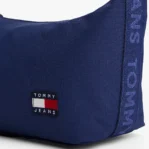 תיק כתף מבית טומי גינס. התיק מצויד ברצועה מתכווננת ולוגו המזוהה עם המותג.